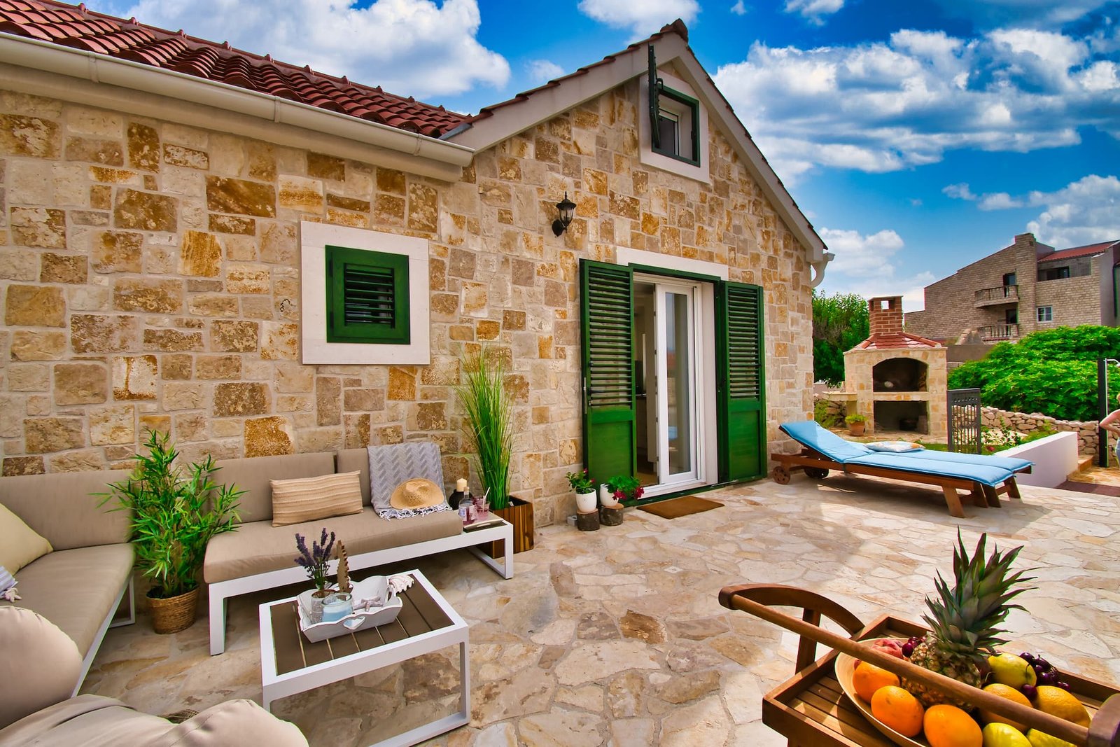 The property is surrounded by a spacious terrace that blends seamlessly with a Mediterranean garden filled with olive trees, fig trees, and grapevines. The front terrace, facing the sea, is perfect for relaxing, sunbathing, and enjoying quiet, warm summer evenings. The back terrace provides an intimate outdoor dining area, while the outdoor shower adds convenience after returning from the beach.